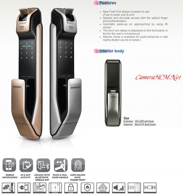 Khóa sử dụng màn hình cảm ứng có đèn LED hiển thị, giúp bạn dễ dàng sử dụng ngay cả khi trời tối. Bên cạnh đó khóa có thể tích hợp thêm điều khiển từ xa hoặc kết nối với chuông hình. Khóa cửa vân tay Samsung SHP-DP728 được thiết kế đặc biệt khi đóng mở cửa bằng thao tác đẩy-kéo (Push-Pull) tiên tiến thay cho dòng tay gạt.