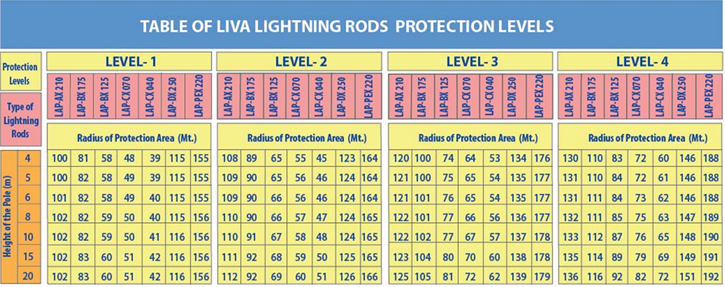 Bán kính bảo vệ của kim thu sét liva được tính theo tiêu chuẩn của Pháp NFC 17-102. Theo đó, việc xác định vùng an toàn phụ thuộc vào nhiều thông số kỹ thuật.