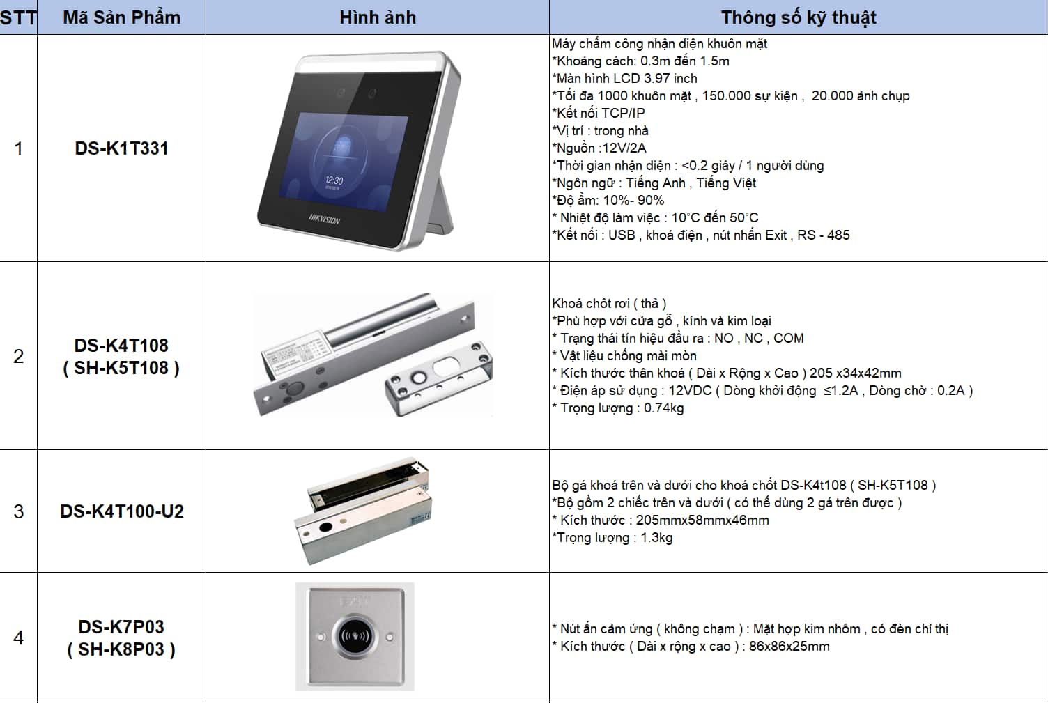 Mọi thông tin về các sản phẩm được cung cấp đầy đủ dưới bảng sau: