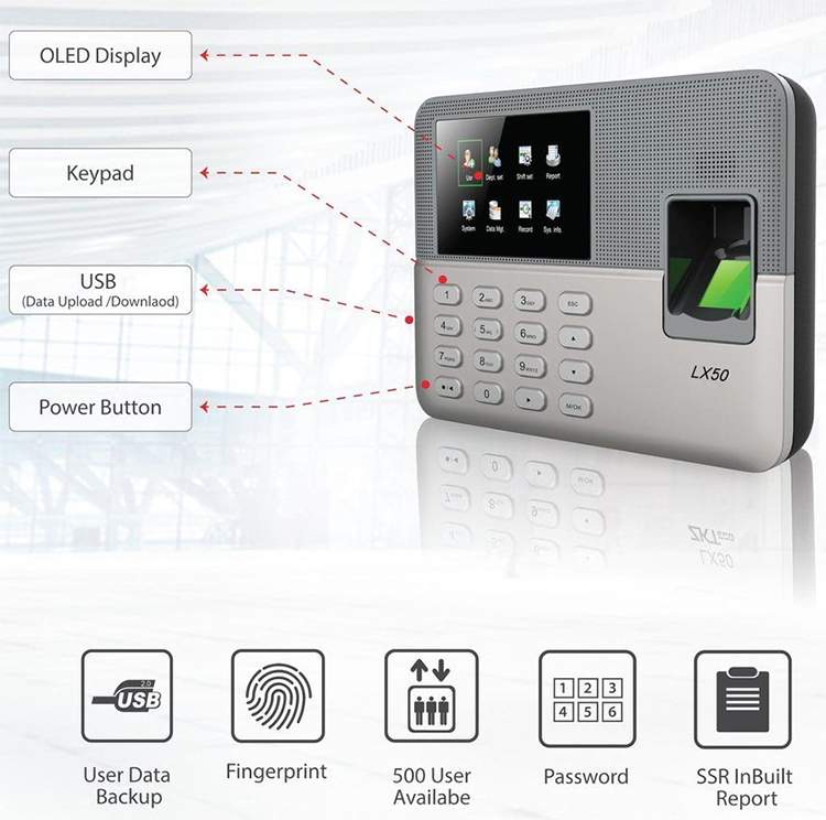 Với máy chấm công vân tay LX50 dùng cho số lượng nhân viên dưới 50 người, lấy dữ liệu bằng USB, để trên bàn hay gắn trên tường đều rất tiện lợi, bớt được chi phí đi dây mạng, dây điện. chỉ cần cắm nguồn 5V hoặc cắm cổng USB là có thể sử dụng được, không gian đạt thẩm mỹ tối đa.