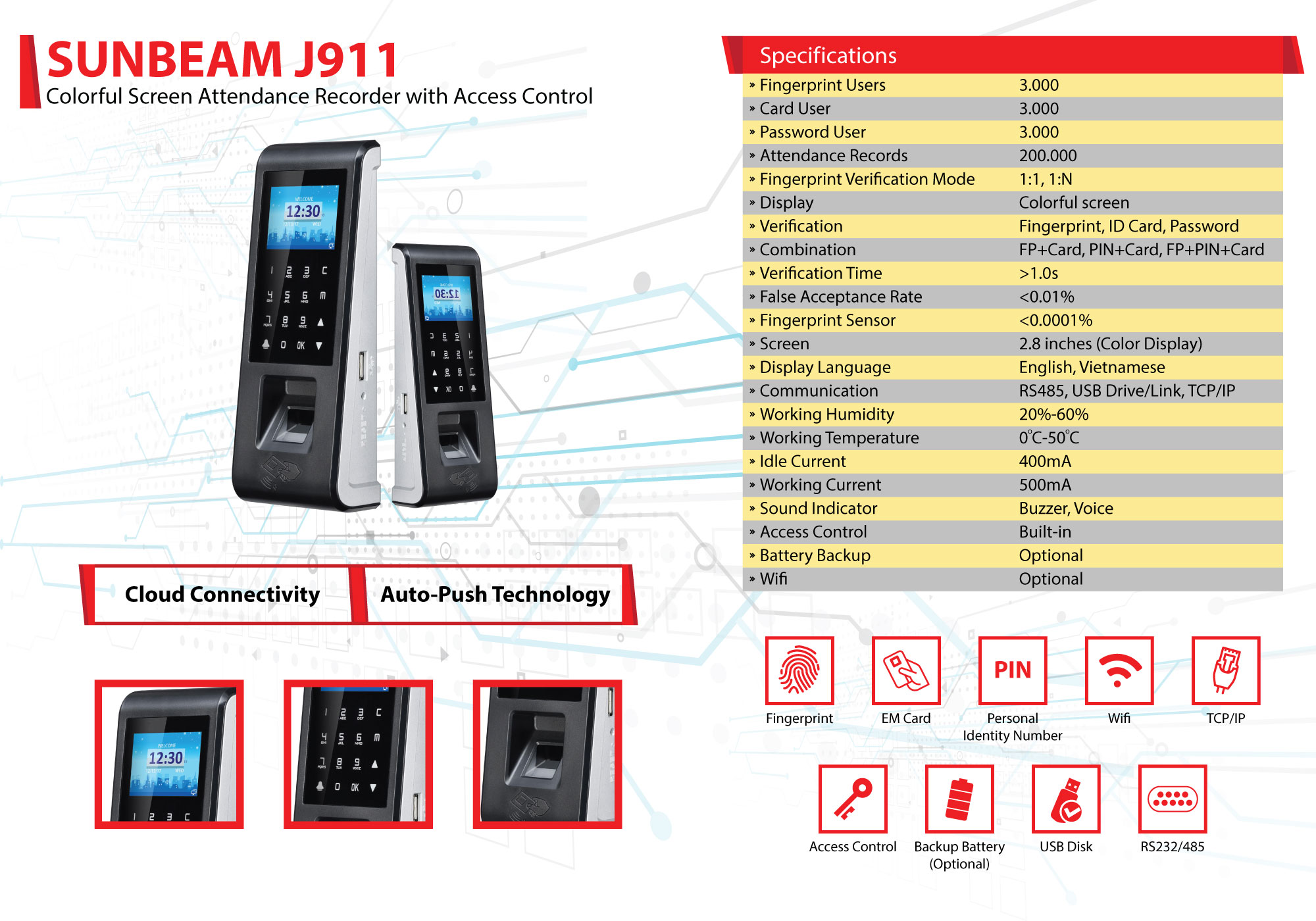 Sunbeam J911 được sử dụng phổ biến tại các cơ quan, văn phòng công ty. Máy có 2 chức năng: chấm công bằng vân tay và tích hợp chức năng kiểm soát cửa ra vào, tránh kẻ gian đột nhập.