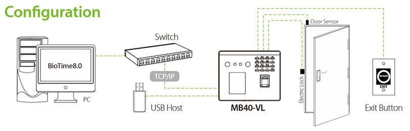 Máy chấm công vân tay ZKTECO MB40-VL kết nối thông qua TCP/IP và USB host, đảm bảo việc truyền tải dữ liệu và kết nối trơn tru.