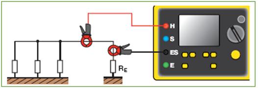 Đối với hệ thống nối đất liên hợp có hệ thống nối đất riêng lẻ kết nối ngầm với nhau. Khi đo cần tiến hành cô lập từng hệ thống nối đất riêng lẻ bằng cách sử dụng thêm các kìm đo. Điện áp cực và điện áp dòng sẽ được bố trí như phương pháp đo 3 cực, tuy nhiên, dòng điện sẽ được đo bởi kìm cố định trên cọc nối đất. Đồng hồ đo sẽ tính toán điện trở bằng giá trị của dòng điện chạy qua cọc nối đất.