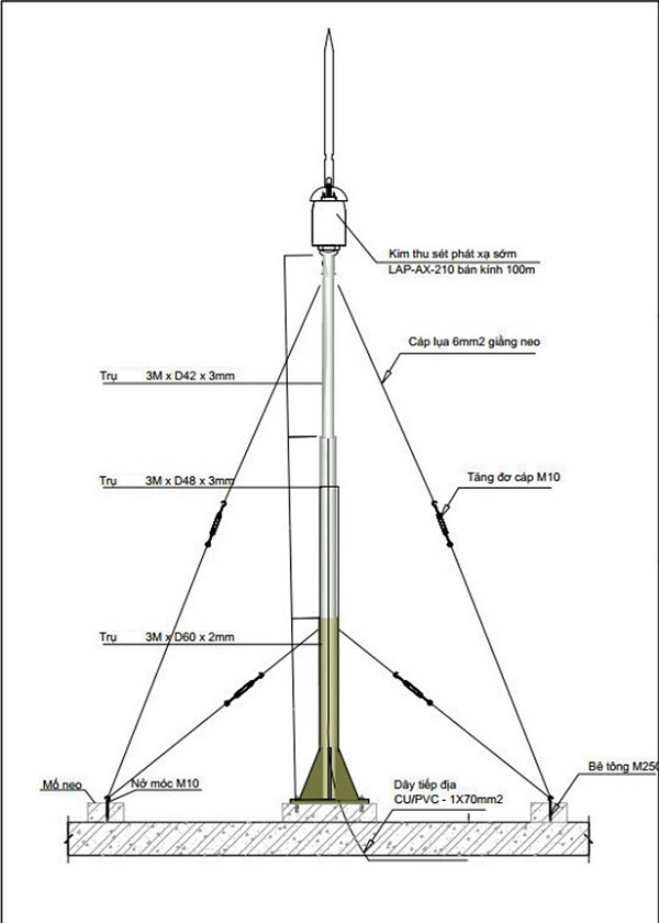 Cách làm chống sét hiệu quả tại Bắc Ninh đảm bảo công trình có tuổi thọ từ vài chục năm đến trăm năm, cột đỡ kim thu sét được gia công bằng thép mạ kẽm hoặc inox. Sau đó cần bắt dây neo tăng đơ cho cột để gia cố thêm phần chịu lực, phòng khi có gió bão lớn.