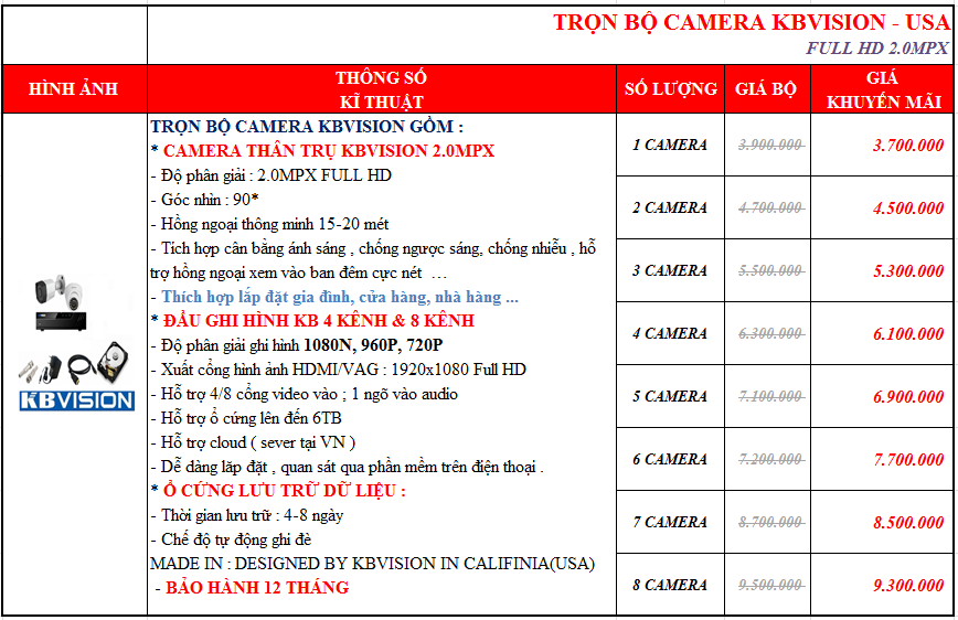 BẢNG GIÁ CAMERA TRỌN BỘ KBVISION ĐỘ PHÂN GIẢI 2.0 MEGAPIXEL