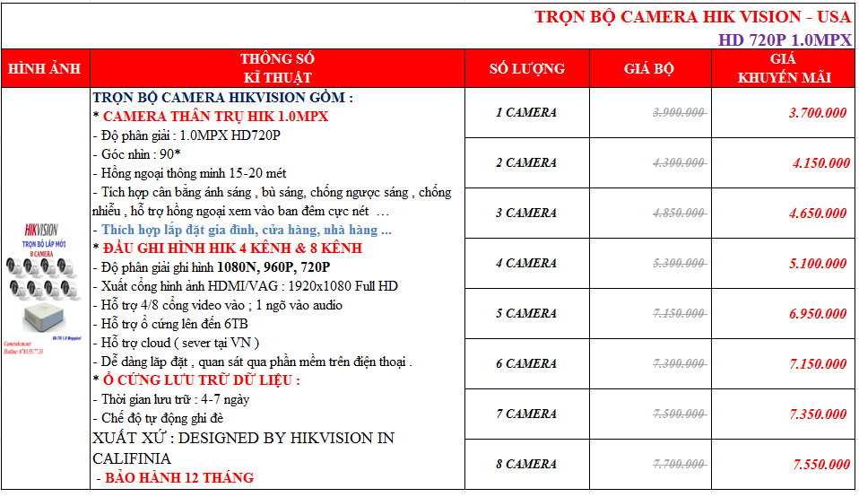 BẢNG GIÁ CAMERA TRỌN BỘ HIKVISION ĐỘ PHÂN GIẢI 1.0 MEGAPIXEL