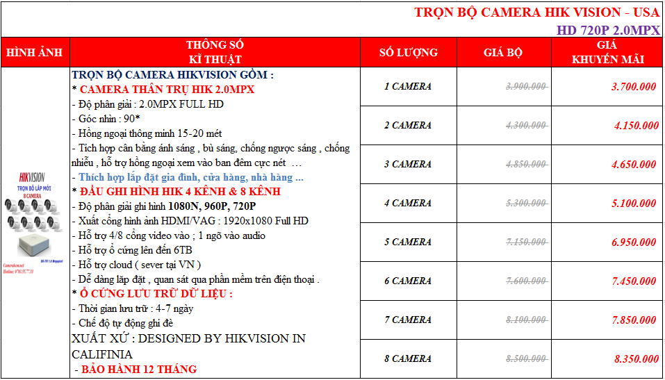 BẢNG GIÁ CAMERA TRỌN BỘ HIKVISION ĐỘ PHÂN GIẢI 2.0 MEGAPIXEL