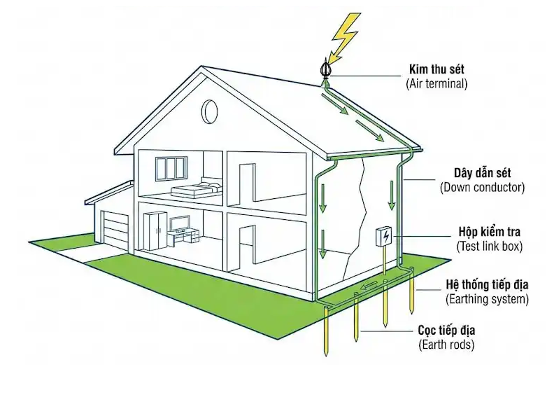 Hệ thống chống sét đánh thẳng cho gia đình bao gồm các thiết bị thiết yếu: Kim thu sét (hiện đại ESE hoặc cổ điển Franklin), dây dẫn sét (cáp đồng trần/bọc), hệ thống tiếp địa (cọc tiếp địa, thuốc/kẹp hàn), cột đỡ kim, và các vật tư phụ (kẹp định vị, bộ đếm sét). Các bộ phận này giúp chủ động thu sét, dẫn dòng điện an toàn xuống đất và bảo vệ cấu trúc nhà ở, thiết bị điện tử