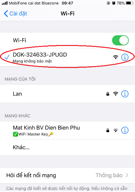 - Sau đó đợi 1 phút để điện thoại kết nối với Wifi và hiện cột sóng Wifi