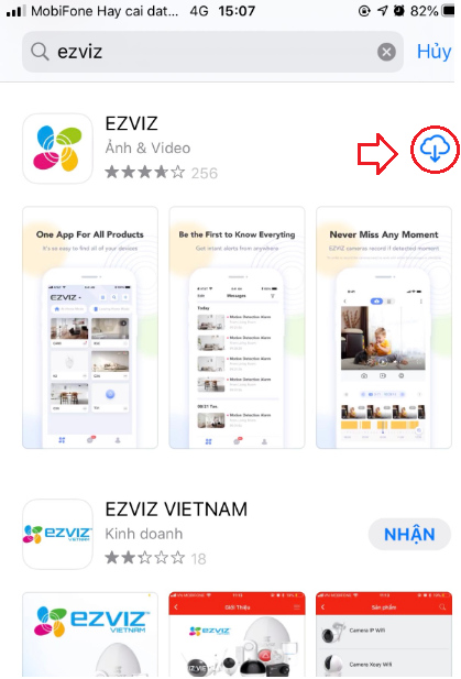 - Với điện thoại IPhone sử dụng hệ điều hành IOS : Vào App Store Trên điện thoại gõ tìm kiếm từ Ezviz và cài đặt ứng dụng có tên Ezviz