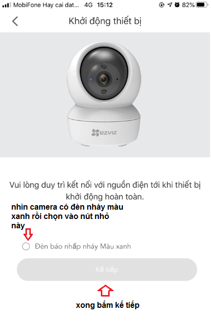 - Quan sát camera , có nháy đèn xanh rồi bấm vào nút tròn nhỏ để đi đến phần cài đặt, Chọn Kế Tiếp