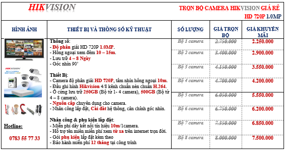 - Bộ camera Hikvision 1.0mpx giá rẻ phù hợp lắp đặt cho gia đình - cửa hàng - nhà xưởng, hỗ trợ hồng ngoại lên tới 10m xem rõ nét vào ban đêm, độ phân giải HD 720, lưu trữ dài ngày bằng ổ cứng chuyên dụng( có thể nâng cấp ổ cứng để lưu trưc thêm)