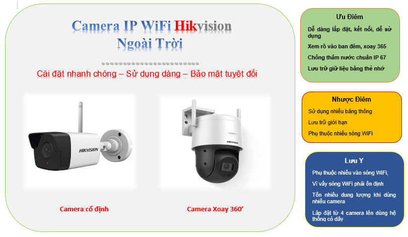 - Camera Wifi không dây là phương án tối ưu và tiện lợi vì những tiện dụng nó mang lại như lắp đặt và sử dụng rất đơn giản và hiệu quả, chỉ cần có mạng wifi ổn định, cấp nguồn và cài đặt kết nối là bạn đã có thể sử dụng được