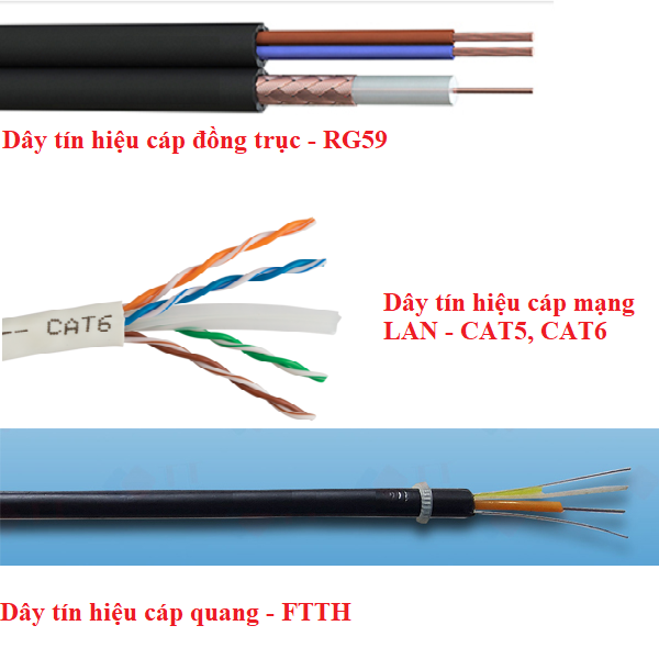 Với giải pháp đi dây tín hiệu chuyên dụng thì sẽ dùng 3 loại dây có thể thi công được như:Dùng dây tín hiệu cáp đồng trục Analog - RG59, Dùng dây tín hiệu cáp mạng LAN, Dùng dây tín hiệu cáp quang - FTTH