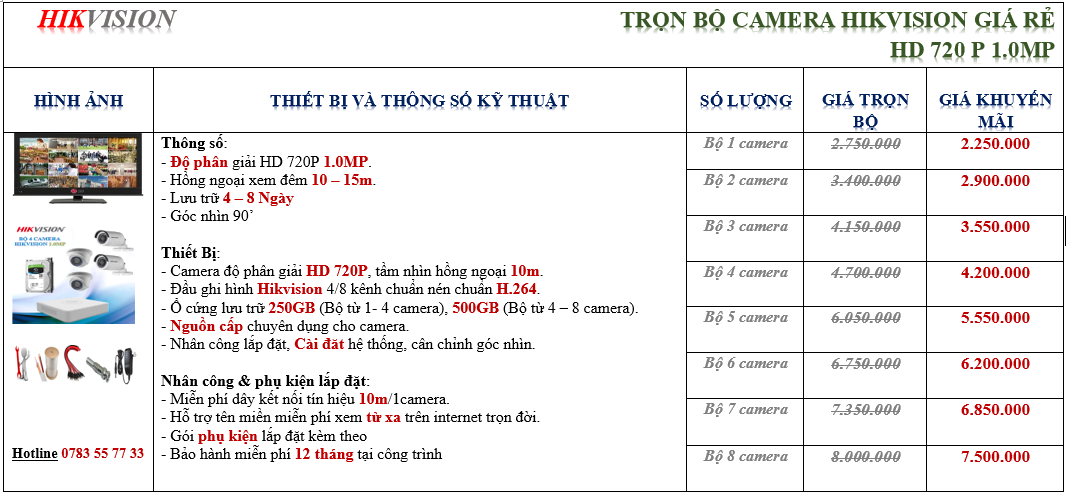 - Bộ camera giá rẻ với đầy đủ chưc năng hồng ngoại xem đêm 10m, chất lượng ổn định, hỗ trợ xem từ xa, lưu trữ bằng ổ cứng chuyên dụng, chất lương HD 720P, phù hợp lắp đặt cho gia đình - cửa hàng - quán ăn.