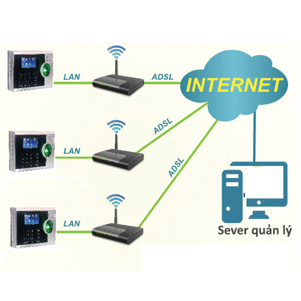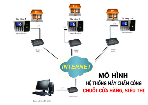 - Hệ thống chấm công cho chuỗi cửa hàng yêu cầu phải có mỗi cửa hàng 1 máy chấm công, 1 tên miền DNS Pro (hoặc IP wan tĩnh), mạng Internet, phần mềm chấm công và máy tính ở trung tâm điều hành.